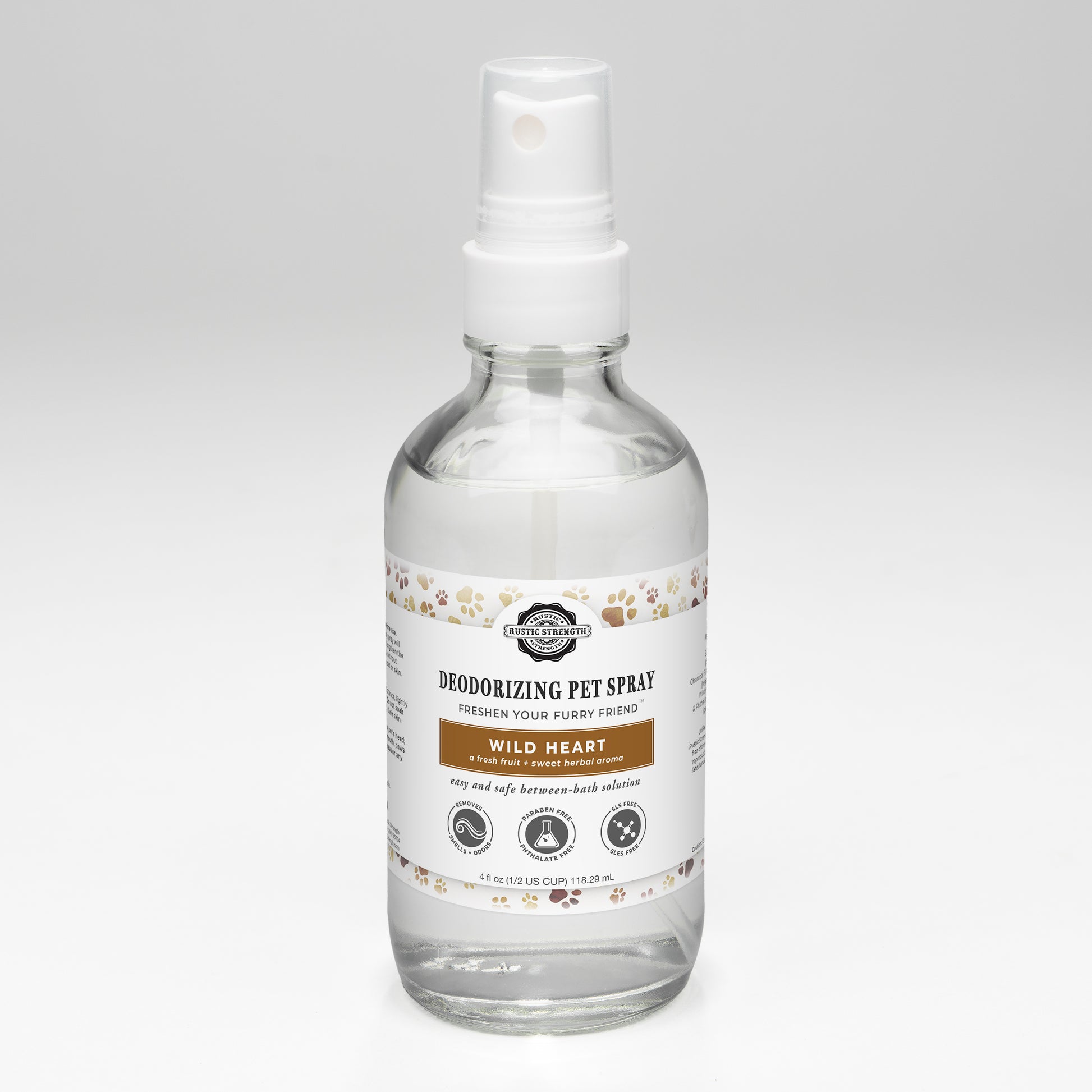 Ethyl Alcohol(deodorizer)Charcoal Filtered Deionized Water (high purity water) Wild Heart Essential Oil & Phthalate-Free Fragrance Oil (pet-safe scent) Unlike most fragrance oils, Rustic Strength’s oils are 100% certified free of the 624 carcinogens and 323 reproductive/developmental toxins listed under California’s Prop 65 act.