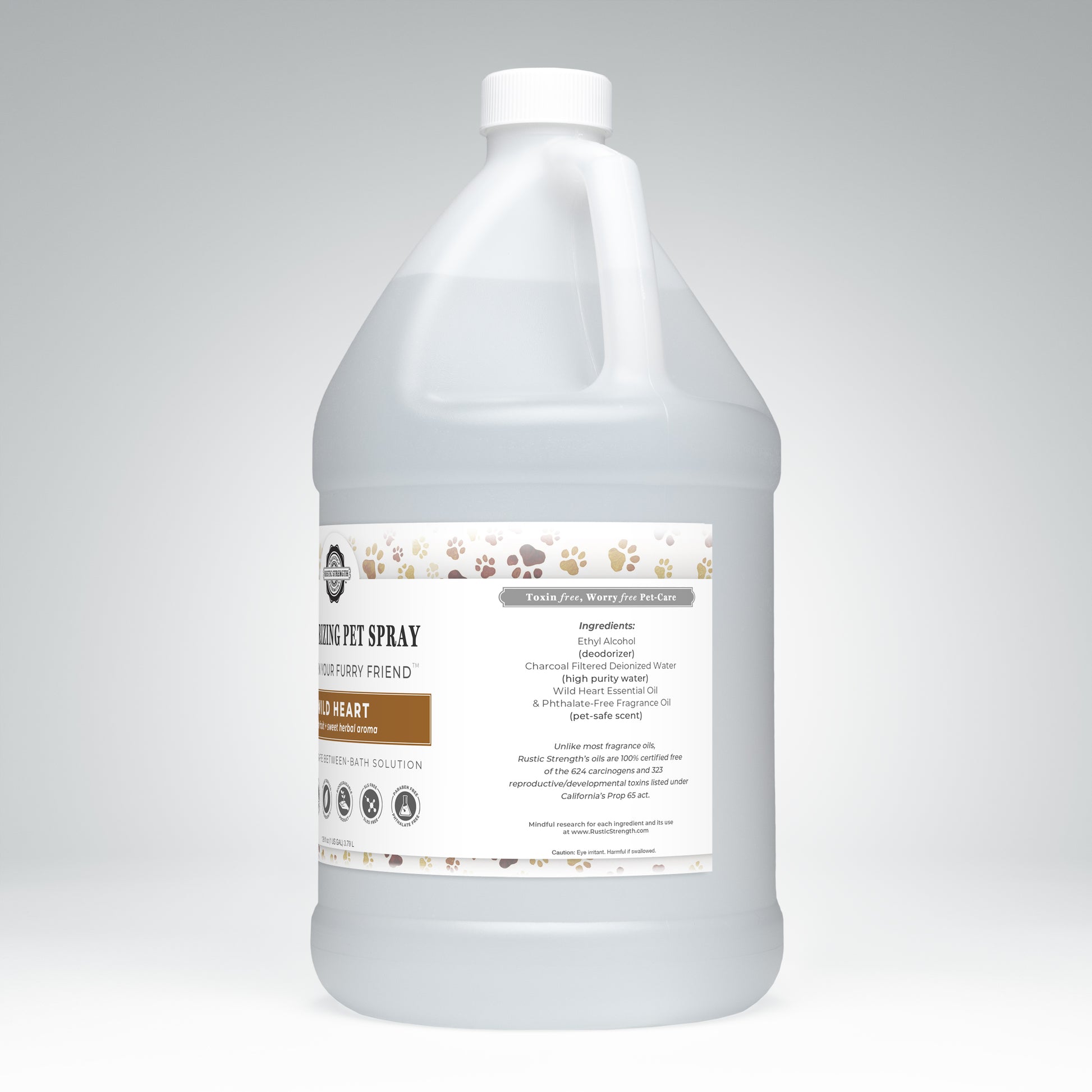 Ethyl Alcohol(deodorizer)Charcoal Filtered Deionized Water (high purity water) Wild Heart Essential Oil & Phthalate-Free Fragrance Oil (pet-safe scent) Unlike most fragrance oils, Rustic Strength’s oils are 100% certified free of the 624 carcinogens and 323 reproductive/developmental toxins listed under California’s Prop 65 act.