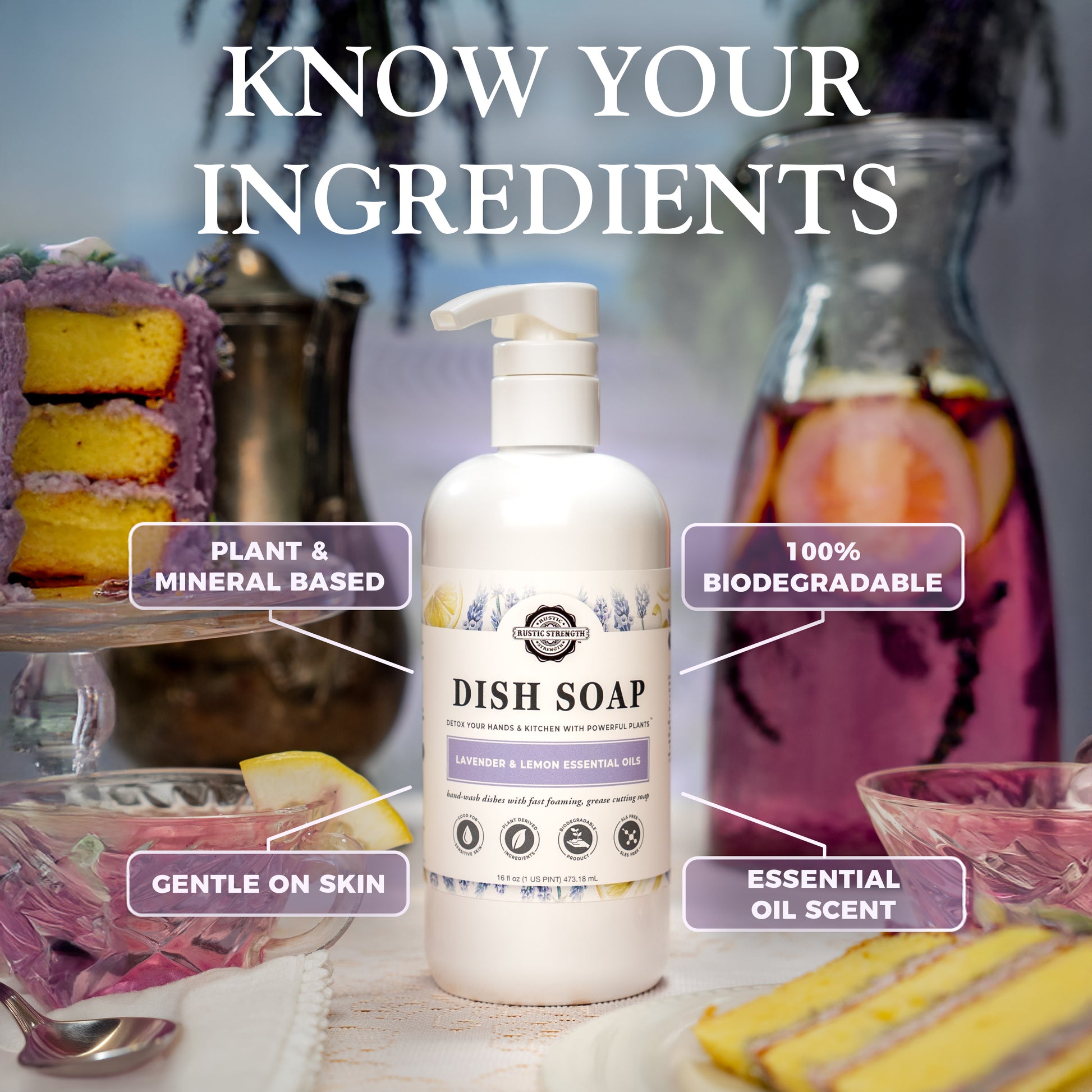 Strong-working Liquid Dishwashing Soap, made from renewable plant + Earth mineral-derived ingredients.