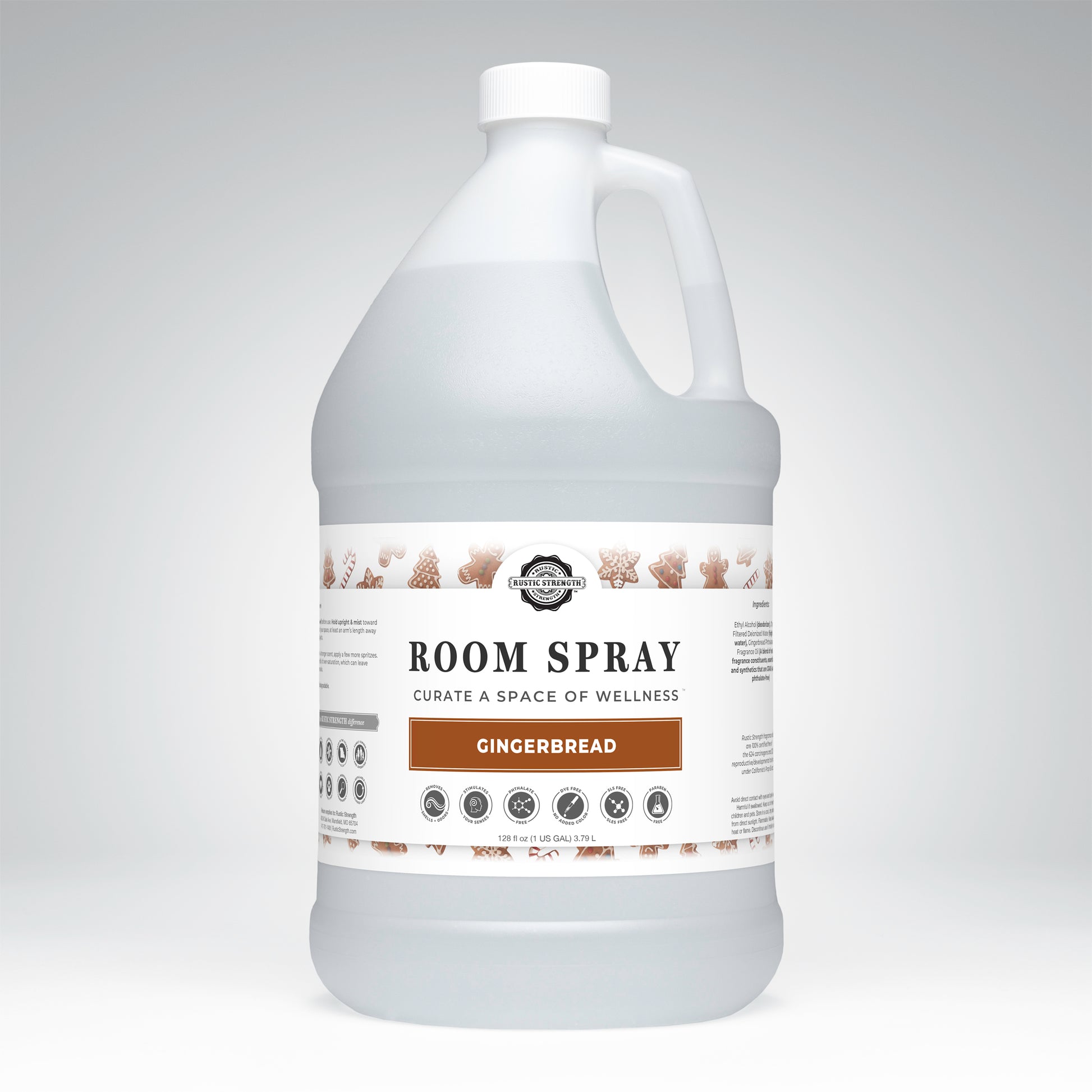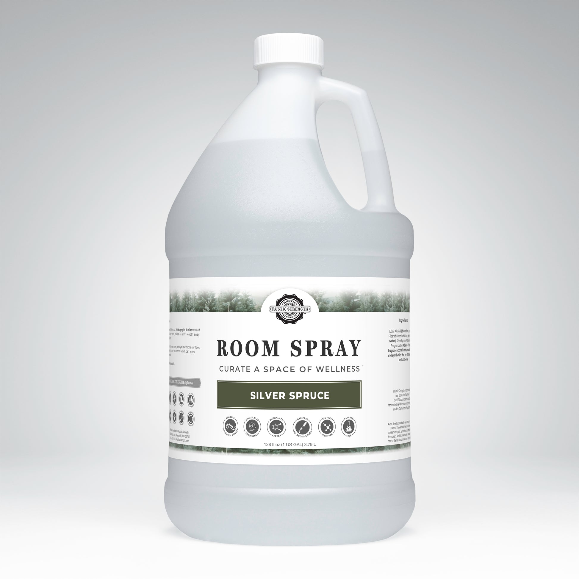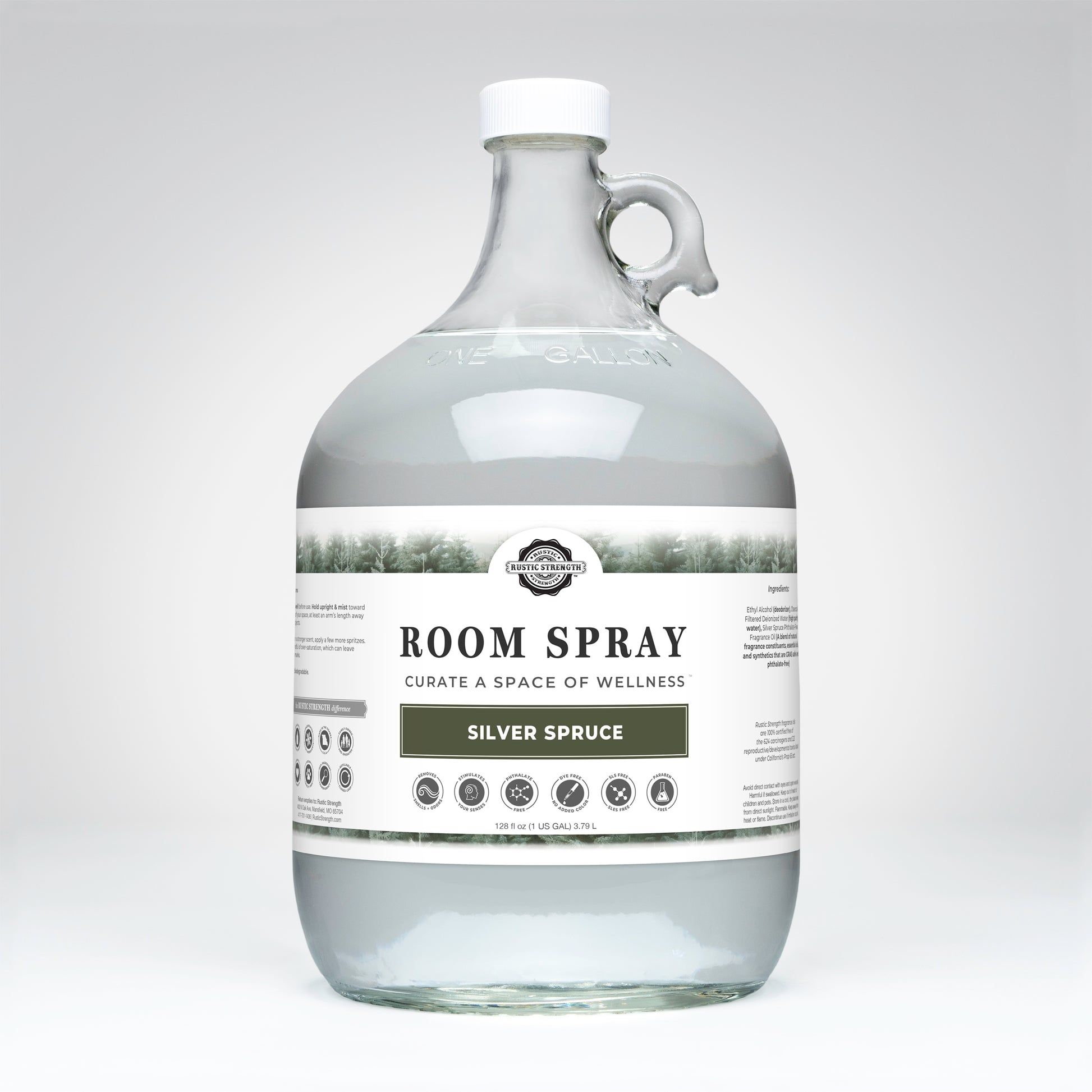 Ethyl Alcohol (deodorizer)Charcoal Filtered Deionized Water (high purity water) EssentialOils and/or Phthalate-Free Fragrance Oils that are GRAS safe (essential oils)Rustic Strength fragrance oils are 100% certified free of the 624 carcinogens and 323 reproductive/ developmental toxins listed under California’sProp 65 act.