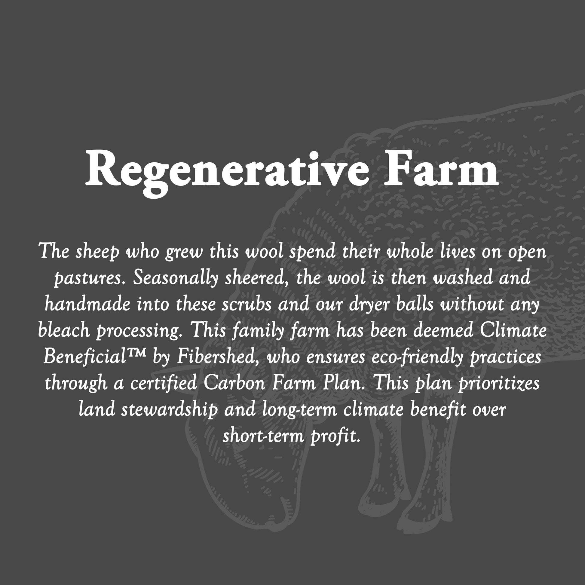 Regenerative Farm | The sheep who grew this wool spend their whole lives on open pastures. Seasonally sheared, the wool is then washed and handmade into these scrubs and our dryer balls without any bleach processing. This family farm has been deemed Climate Beneficial™ by Fibershed, who ensures eco-friendly practices through a certified Carbon Farm Plan. This plan prioritizes land stewardship and long-term climate benefits over short-term profit.