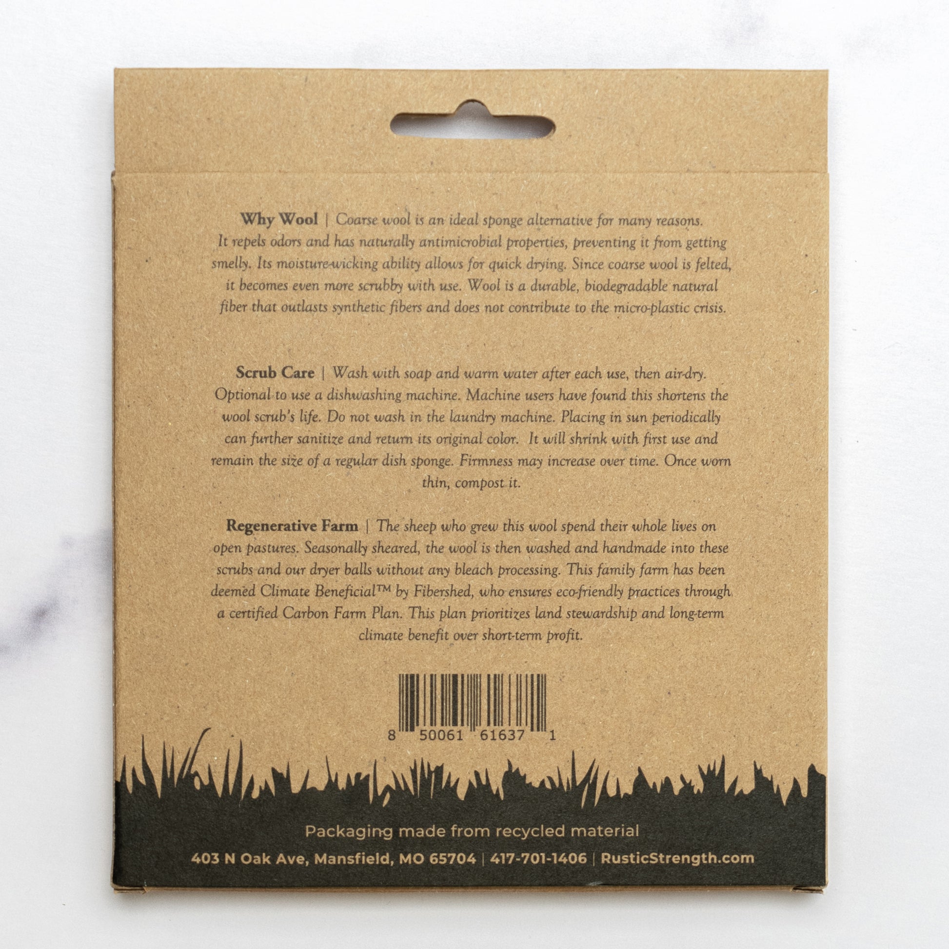 Scrub Care | Wash with soap and warm water after each use, then air dry. Optional to use a dishwashing machine. Machine users have found this shortens the wool scrub’s life to around 4 months. Do not wash in the laundry machine. Placing in the sun periodically can further sanitize and return white color. It will tighten with first use and remain the size of a regular dish sponge. Firmness may increase over time to gain scrubbing power. Once worn thin, compost them.